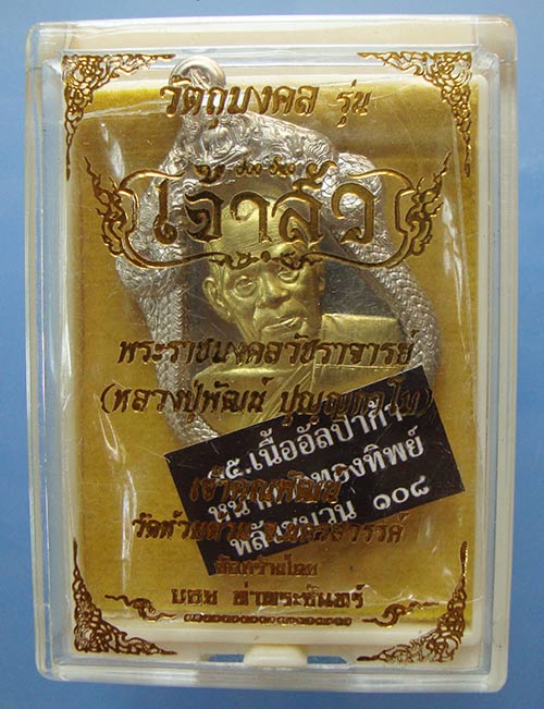 เหรียญรุ่นเจ้าสัวเนื้ออัลปาก้าหน้ากากทองทิพย์หลังชนวน 108 หลวงพ่อพัฒน์ วัดห้วยด้วน บอยท่าพระจันทร์สร้างครับ |