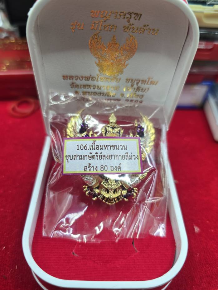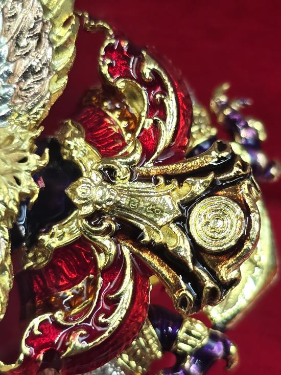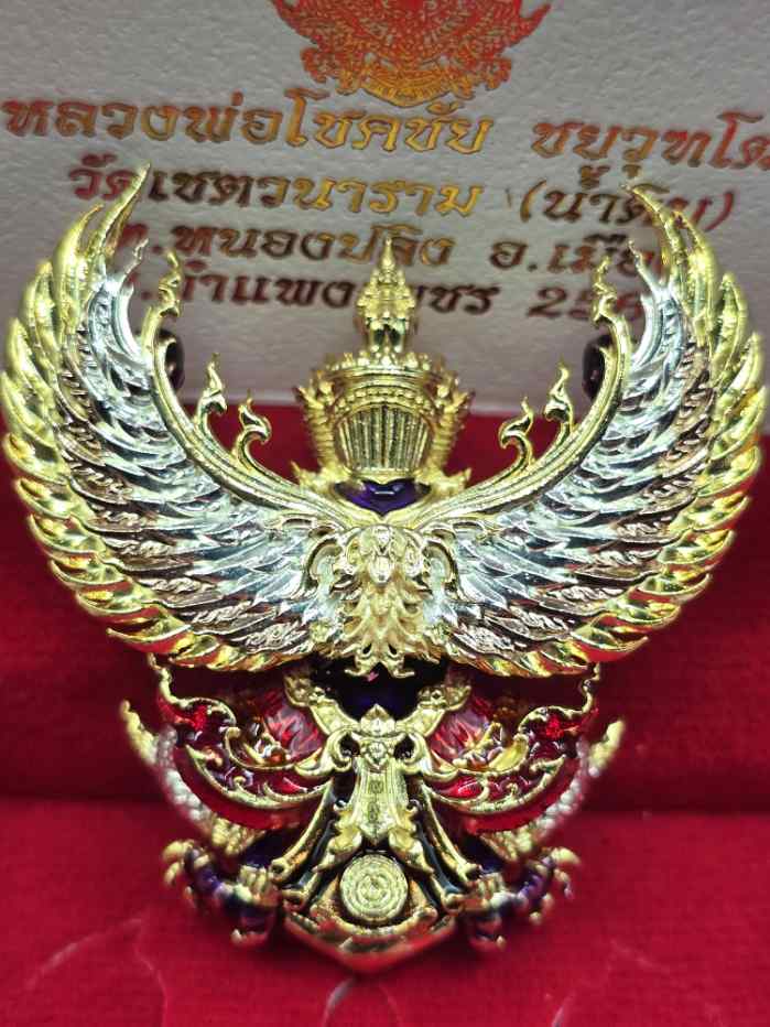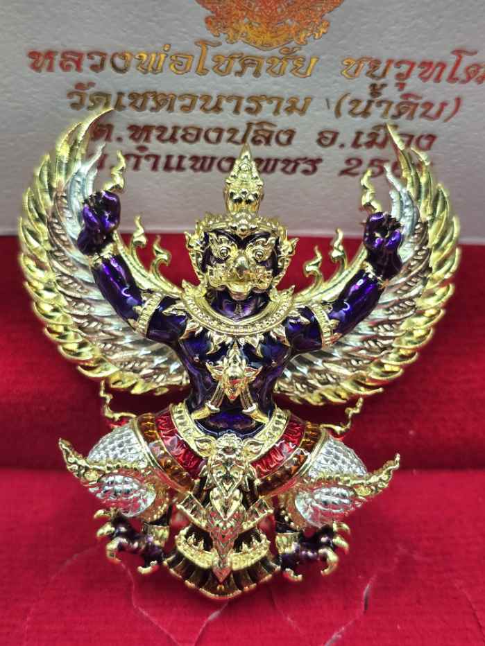 พญาครุฑ รุ่นมีโชคพันล้าน หลวงพ่อโชคชัย วัดน้ำดิบ เนื้อมหาชนวนชุบ3kลงยากายม่วง สร้าง 80 องค์ หมายเลข 50 |