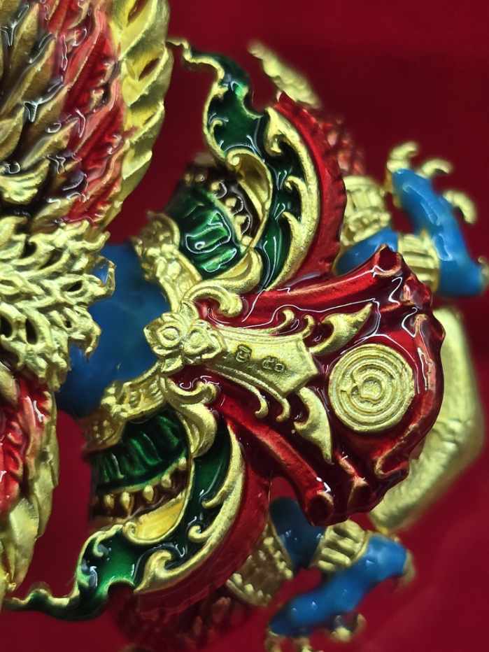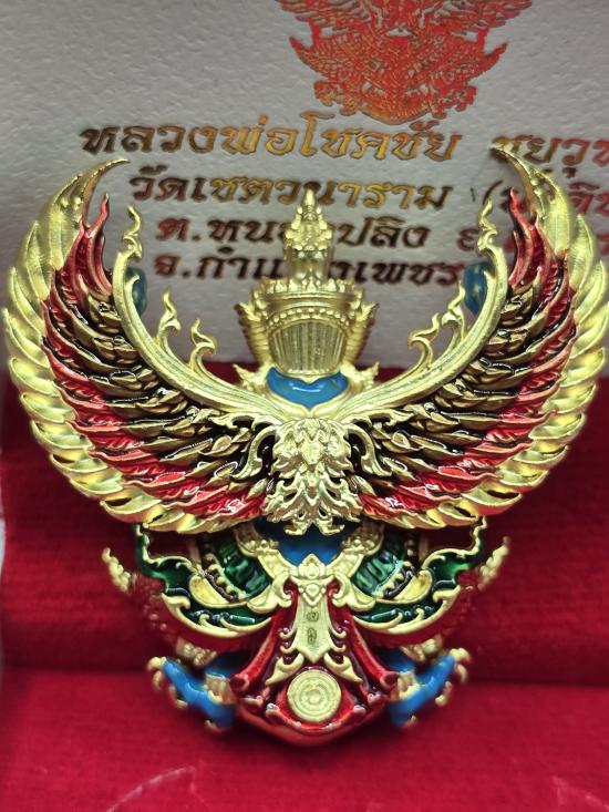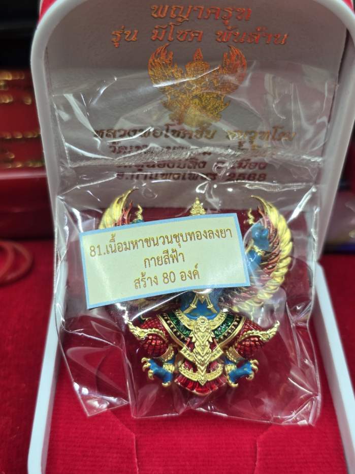 พญาครุฑ รุ่นมีโชคพันล้าน หลวงพ่อโชคชัย วัดน้ำดิบ เนื้อมหาชนวนชุบทองลงยากายฟ้า สร้าง 80 องค์ หมายเลข 56 |