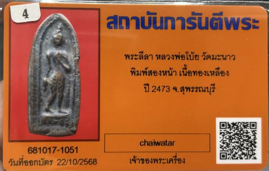 พระลีลา หลวงพ่อโบ้ย วัดมะนาว พิมพ์สองหน้า เนื้อทองเหลือง ปี 2473 จ.สุพรรณบุรี |