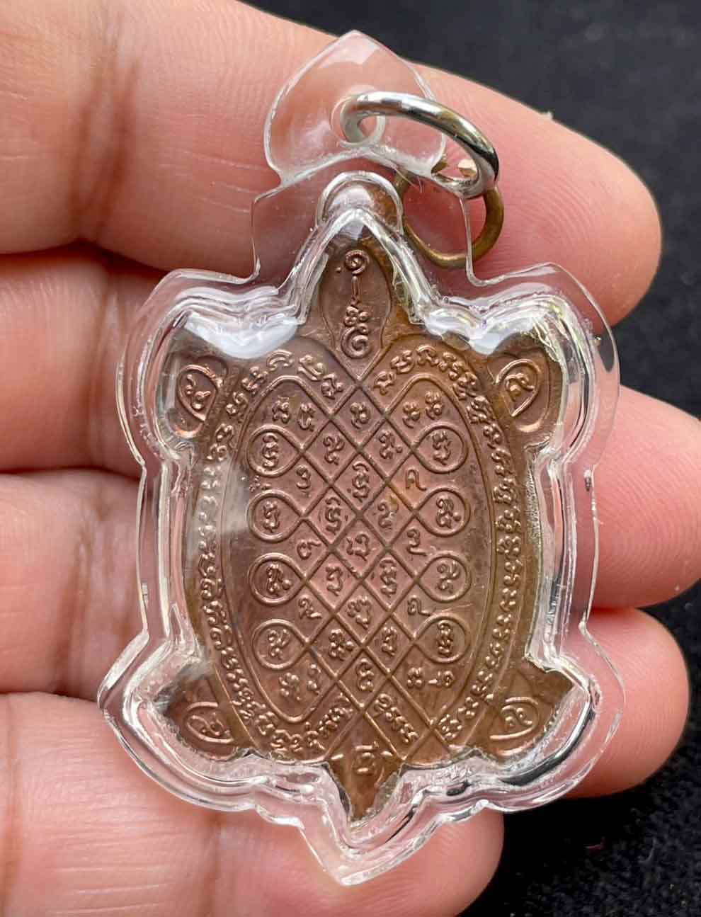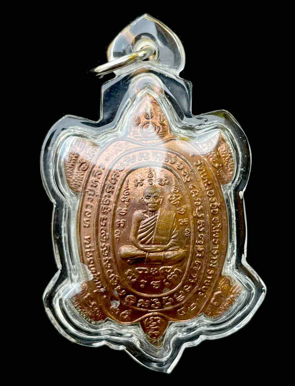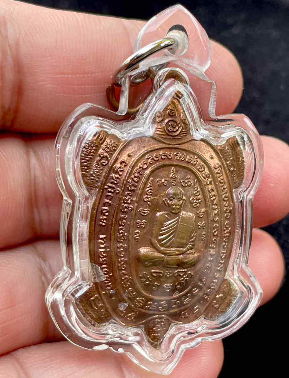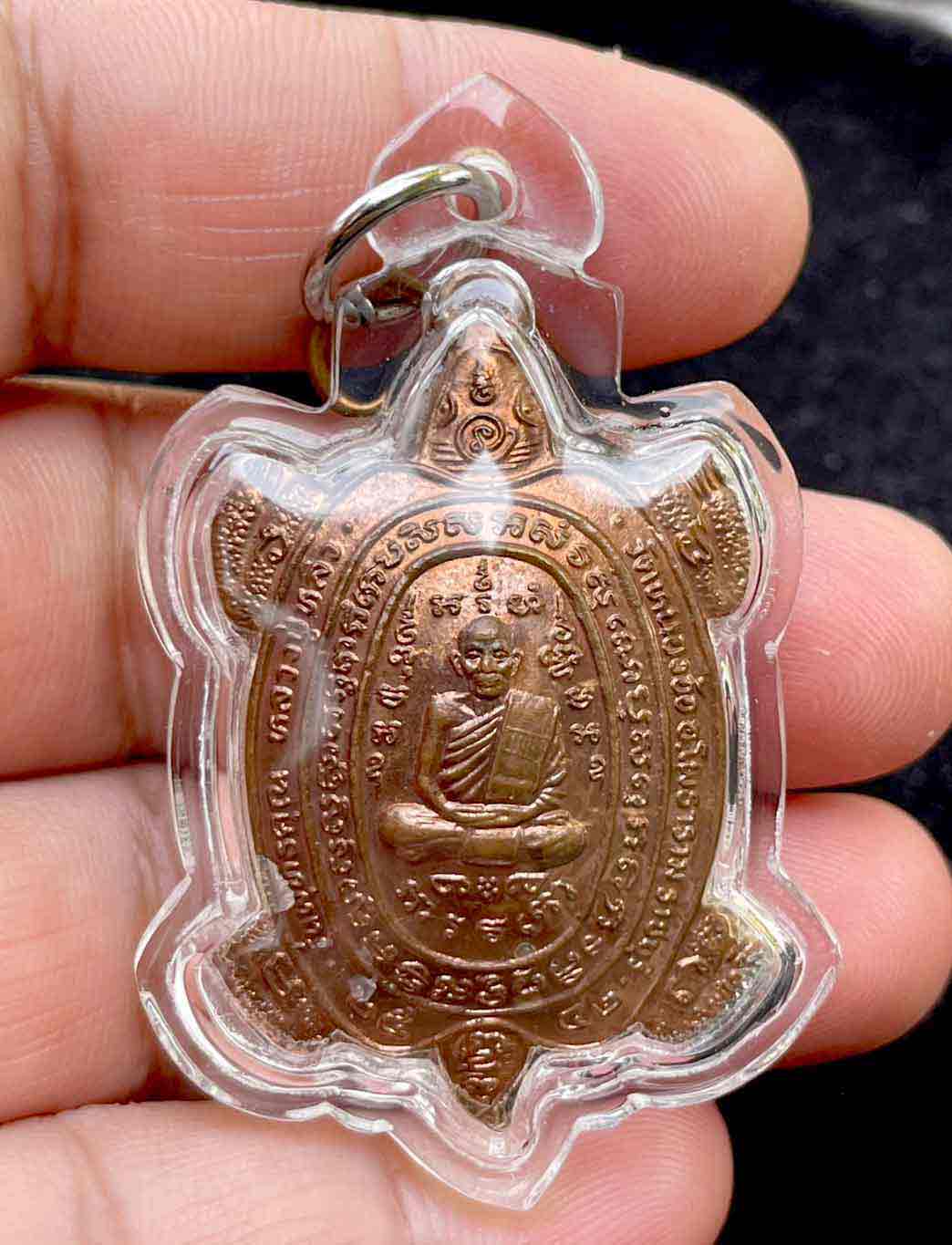 วัดใจ เหรียญเต่า รุ่น พุทธคุณ หลวงปู่หลิว วัดหนองอ้อ จ.ราชบุรี ปี 2542 เนื้อทองแดง เลี่ยมพลาสติก สวยงาม