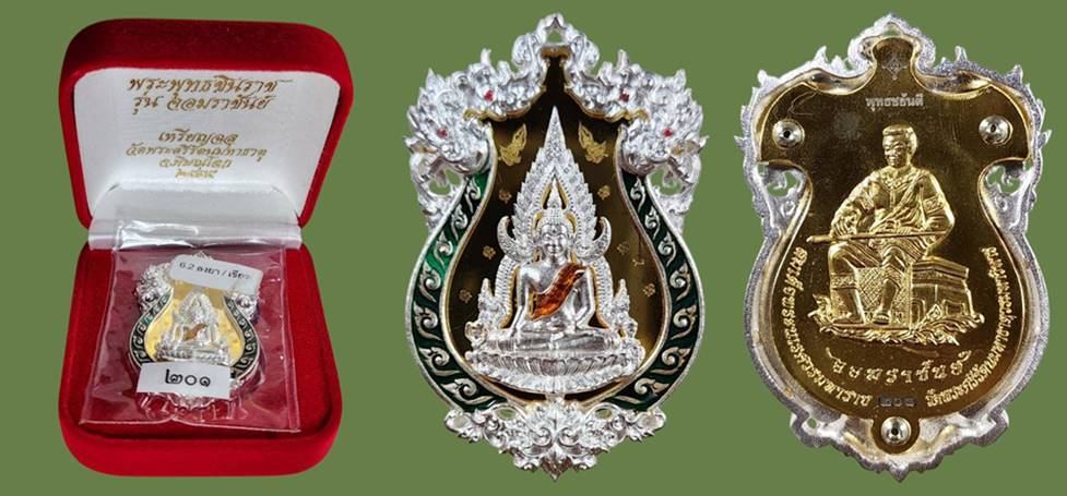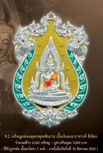 เหรียญหล่อฉลุพระพุทธชินราช รุ่น จอมราชันย์ วัดพระศรีรัตนมหาธาตุฯ จ.พิษณุโลก ปี 2555 - เนื้อเงินลงยาราชาวดี สีเขียว หมายเลข 201 (พุทธยันตรี)สภาพสวยกล่องพร้อมครับ -:ซีลเดิมๆครับ
