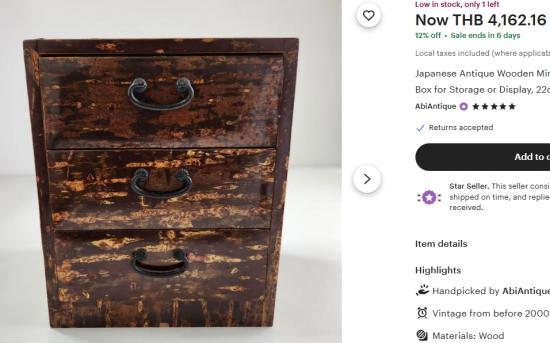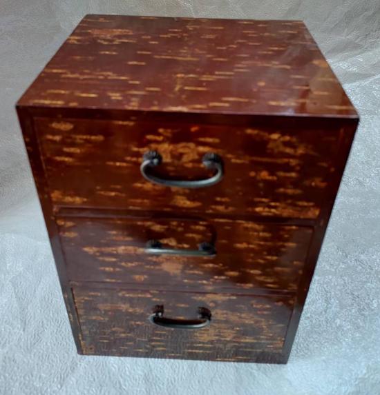 กล่องไม้วินเทจญี่ปุ่น งานฝีมือเก่า 3 ลิ้นชัก สามารถวางพระบูชา 5 นิ้วได้ ขนาด 18 x 22 x สูง 30 ซม.ทำจากเปลือกเชอร์รี่(ต้นซากุระ)รอบใบ