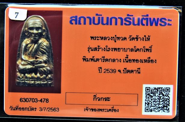 หลวงปู่ทวด วัดช้างให้ รุ่นสร้างโรงพยาบาลโคกโพธิ์ พิมพ์เตารีดกลาง เนื้อทองเหลือง ปี 2539 พร้อมกล่อง 22172322