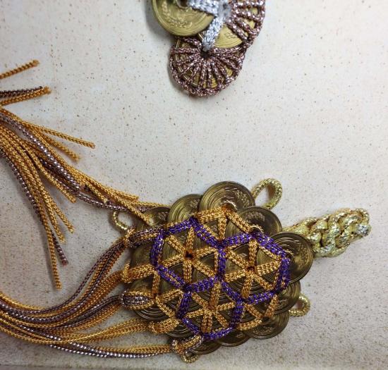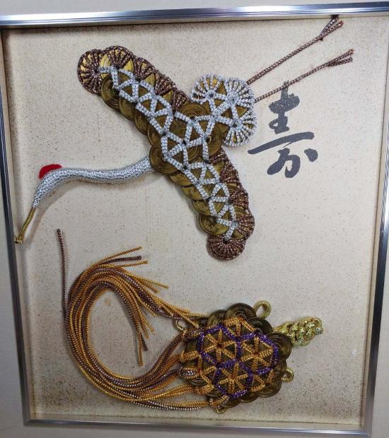 เหรียญ 5 เยน ทำเป็นเครื่องรางนำโชค งานฝีมือแบบญี่ปุ่นดั้งเดิม โดยมีนกกระเรียน (สึรุ) และเต่า (คาเมะ) ซึ่งเป็นสัญลักษณ์ของอายุยืนยาวและความโชคดี