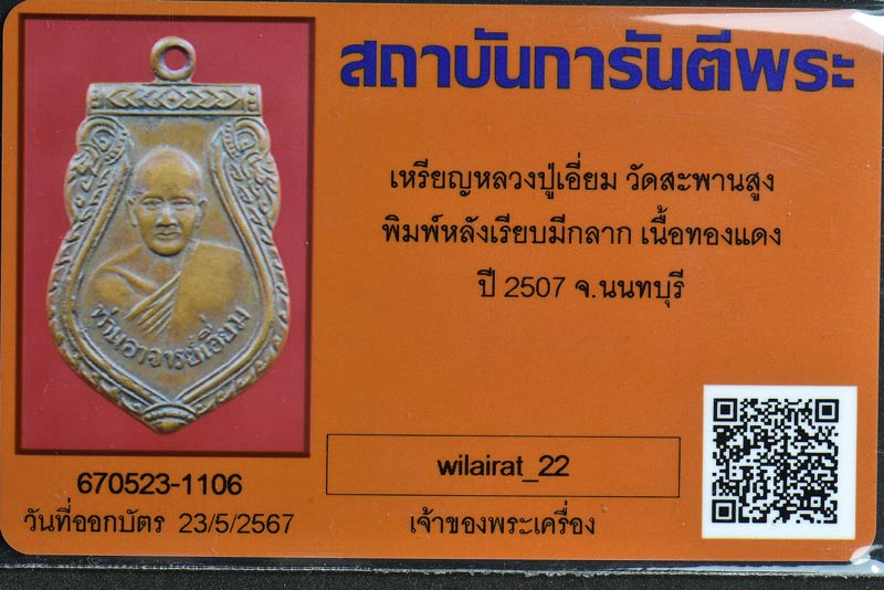 เหรียญหลวงปู่เอี่ยม วัดสะพานสูง พิมพ์หลังเรียบมีกลาก เนื้อทองแดง ปี07 พร้อมบัตรรับรอง