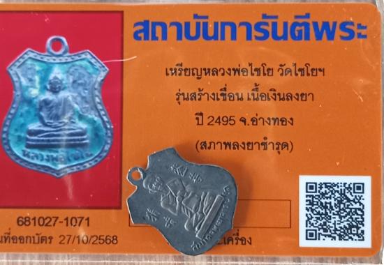 เคาะเดียวแดง+++เหรียญหลวงพ่อไชโย วัดไชโยฯ รุ่นสร้างเขื่อน เนื้อเงินลงยาปี 2495 จ.อ่างทองพร้อมบัตรรับรองพระแท้ (สภาพลงยาชำรุด)