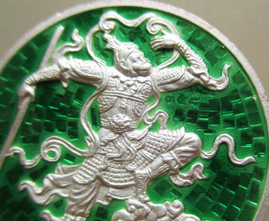 เหรียญเทพหนุมานหลังเจ้าพ่อเห้งเจีย ศาลพระกาฬ จ.ลพบุรี รุ่น ส ะท้านไตรภพ พิธีมหาพุทธาภิเษก พ.ศ.2547 เนื้อเงิน ลงยาสีน้ำเงิน - เขียว ต อกโค๊ต ตอกเลข สภาพสวยกริ๊บๆ !!