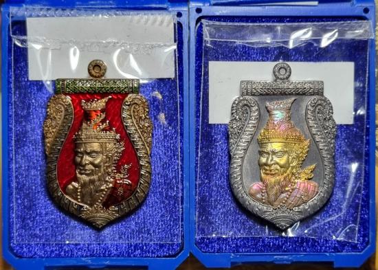 (2 เหรียญ) เหรียญเสมาพ่อปู่ฤาษี รุ่นบูชาครู ปลุกเสก พระอาจารย์ประสูติ วัดในเตา ,อาจารย์เทียม วัดหนัง (รก.34 ชนวน ลงยาพื้นแดง เลข 89 + รก.57 ตะกั่วอวน หน้ากากชนวนรุ้ง เลข 114) พร้อมกล่อง