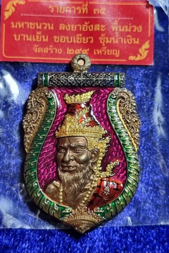 - รก.35 มหาชนวน ลงยาอังสะ พื้นม่วงบานเย็น ขอบเขียว ซุ้มน้ำเงิน