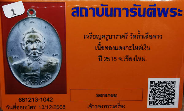 เหรียญครูบาราศรี วัดถ้ำเสือดาว เนื้อทองแดงกะไหล่เเงิน(พบเจอน้อย) ปี2518 จ.เชียงใหม่ + บัตรG-pra สภาพเดิมค่ะ