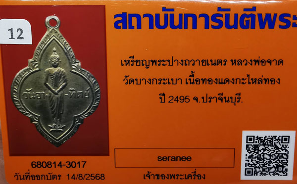 (วันอาทิตย์)เหรียญพระปางถวายเนตร หลวงพ่อจาด วัดบางกระเบา เนื้อทองแดงกะไหล่ทอง ปี2495 + บัตรG-pra สภาพเดิมค่ะ