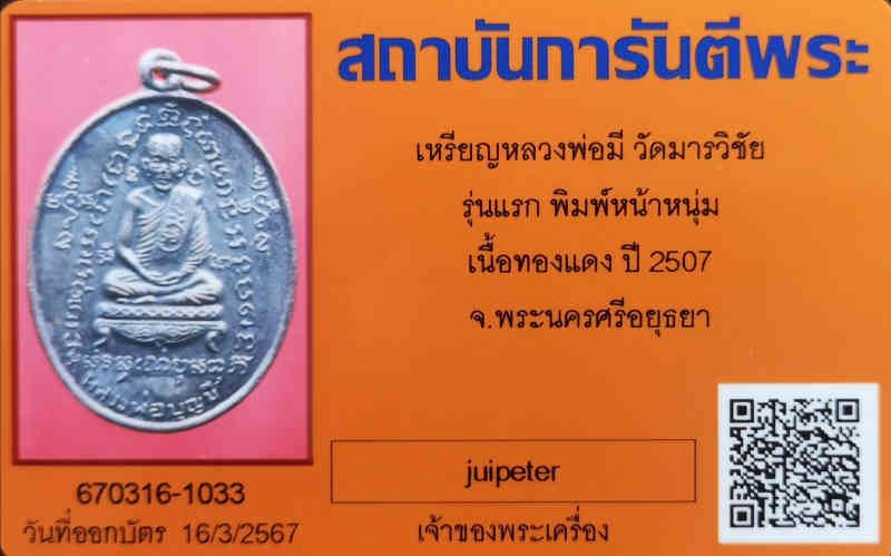 เหรียญหลวงพ่อมี วัดมารวิชัย รุ่นแรก พิมพ์หน้าหนุ่ม เนื้อทองแดง ปี 2507 จ.พระนครศรีอยุธยา พร้อมบัตรรับรอง