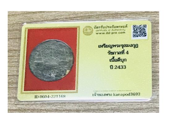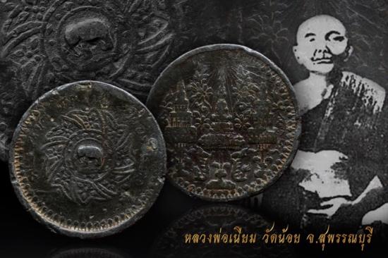 เหรียญพระจุลมงกุฏ - พระแสงจักร รัชกาลที่ 4 หลวงพ่อเนียม วัดน้อย จ.สุพรรณบุรี เนื้อดีบุก ปี 2433 พร้อมบัตรรับรอง |