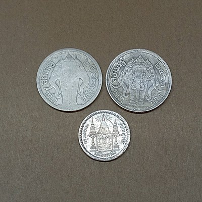 เหรียญ 1 เฟื่อง ร.5 + 2 เหรียญสลึง ร.6 เนื้อเงินรวม 3 เหรียญ