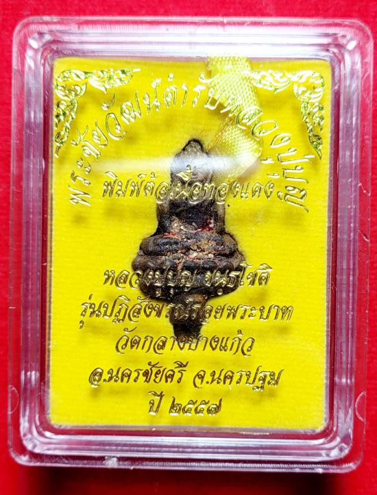 พระชัยวัฒน์พิมพ์ต้อเนื้อทองผสม ตำหรับหลวงปู่บุญวัดกลางบางแก้วจัดสร้างปี 2557 กล่องเดิมๆ สภาพสวยแชมป์ ชนวน มวลสารเก่าๆเยอะมาก |