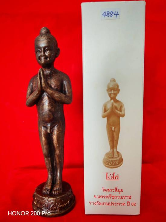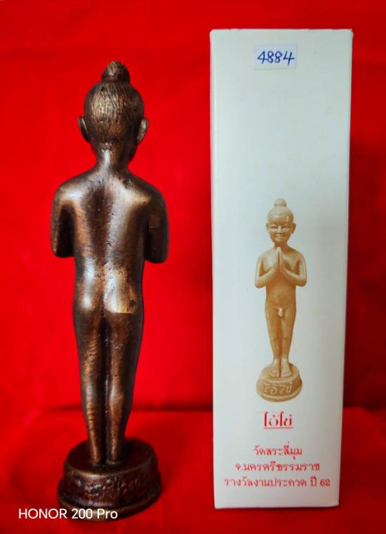 ตอกหมายเลข 4884 เนื้อทองแดง รมดำ พระบูชาไอ้ไข่ ขนาด 6.2 นิ้ว งานประกวดของสมาคมศิษย์เก่าเบญจมราชูทิศ นครศรีธรรมราช ร่วมกับ สมาคมผู้นิยมพระเครื่องพระบูชาไทย สาขานครศรีธรรมราช มาพร้อมกล่องเดิม