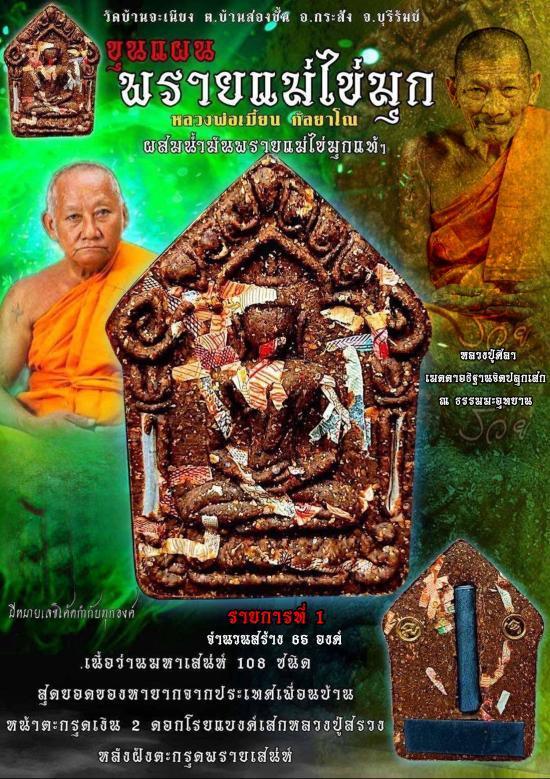 พระขุนแผนพรายแม่ไข่มุก หลวงพ่อเมียน วัดจะเนียง บุรีรัมย์ หลวงปู่มหาศิลา (หลวงปู่ศิลา)อธิษฐานจิต เนื้อว่านมหาเสน่ห์108ชนิดฝังตะกรุดเงิน2ดอกโรยแบงค์เสกหลวงปู่สรวง หลังฝังตะกรุดพรายเสน่ห์ จำนวนสร้างน้อยเพียง 65 องค์เท่านั้น มวลสารเข้มขลัง สวย หายาก ปัจจุบันวัตถุมงคล หลวงพ่อเมียนขยับราคาขึ้นทุกรุ่น พุทธคุณประสบการณ์ของพระเครื่องของท่านยิ่งมากและไม่ธรรมดา จนถึงประสบการณ์ที่ผู้บูชานับถือได้ประสบพบมากับตัวเองแล้วนั้นด้วย วัตถุมงคลหลวงพ่อเมียนประสบการณ์มากมาย ห้ามพลาดด้วยประการทั้งปวงแล้วครับ รับประกันชั้นหนึ่งครับ