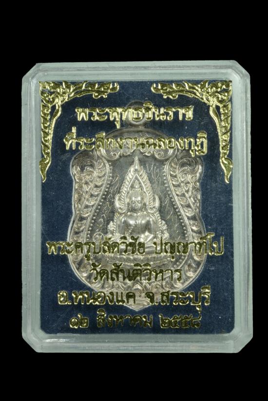 เหรียญพระพุทธชินราช วัดสันติวิหาร จ.สระบุรี รุ่น "เหรียญที่ระลึกในงานฉลองกุฏิ พระครูปลัดวิชัย ปญฺญาทีโป พิธีพุทธาภิเษกใหญ่ ณ อุโบสถวัดสันติวิหาร ต.โคกตูม อ.หนองแค จ.สระบุรี พร้อมกับเลสข้อมือรุ่นมงคลเศรษฐี ๔๖ ในวันที่ ๒๘ มิ.ย. ๒๕๕๘ โดยมีพระเกจินั่งร่วมปรกอธิษฐานจิตความขลัง ได้แก่ พระธรรมปิฎก เจ้าคณะจังหวัดสระบุรี เป็นประธาน, หลวงพ่อพูน วัดบ้านแพน, หลวงพ่อสุนทร วัดหนองสะเดา, หลวงพ่อเมียน วัดจะเนียงวราราม (บ้านจะเนียง), หลวงพ่อเหลือ วัดขอนชะโงก, หลวงพ่อเอื้อน วัดวังแดงใต้, หลวงพ่อศักดิ์ วัดหนองแซงใหญ่หลวงพ่อนพวรรณ วัดเสนานิมิต, หลวงพ่อประจักษ์ วัดชุ้ง, พระครูปลัดสมภูมิ สมจิตฺโต วัดพิชยญาติการาม และพระครูปลัดวิชัย ปญฺญาทีโป วัดสันติวิหาร