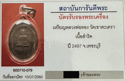 เหรียญ"เนื้อสำริด"หลวงพ่อทอง วัดเขาตะเครา จ.เพชรบุรี ปี ๒๔๙๗..สภาพสวยผิวเดิมๆ..โดยเหรียญหลวงพ่อทอง วัดเขาตะเครา จ.เพชรบุรี ปี๒๔๙๗ จัดสร้างโดยหลวงพ่ออินทร์ วัดยาง เจ้าคณะจังหวัดเพชรบุรี และพระเกจิฯ ชื่อดัง ยุคเก่าของจังหวัดเพชรบุรีช่วงปี ๒๔๙๗ ร่วมปลุกเสก อาทิ เช่น หลวงพ่อแดง วัดเขาบันไดอิฐ,หลวงพ่อทองศุข วัดตะโนดหลวง ฯลฯ เป็นต้น..สภาพสวยเดิมพร้อมเลี่ยม..ปัจจุบันหาไม่ง่ายแล้วตอนนี้..ประสบการณ์ดีไม่ผิดหวังครับ ***รับประกัน***