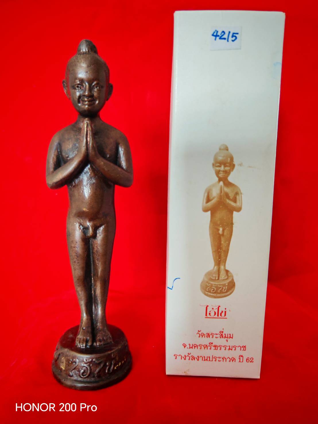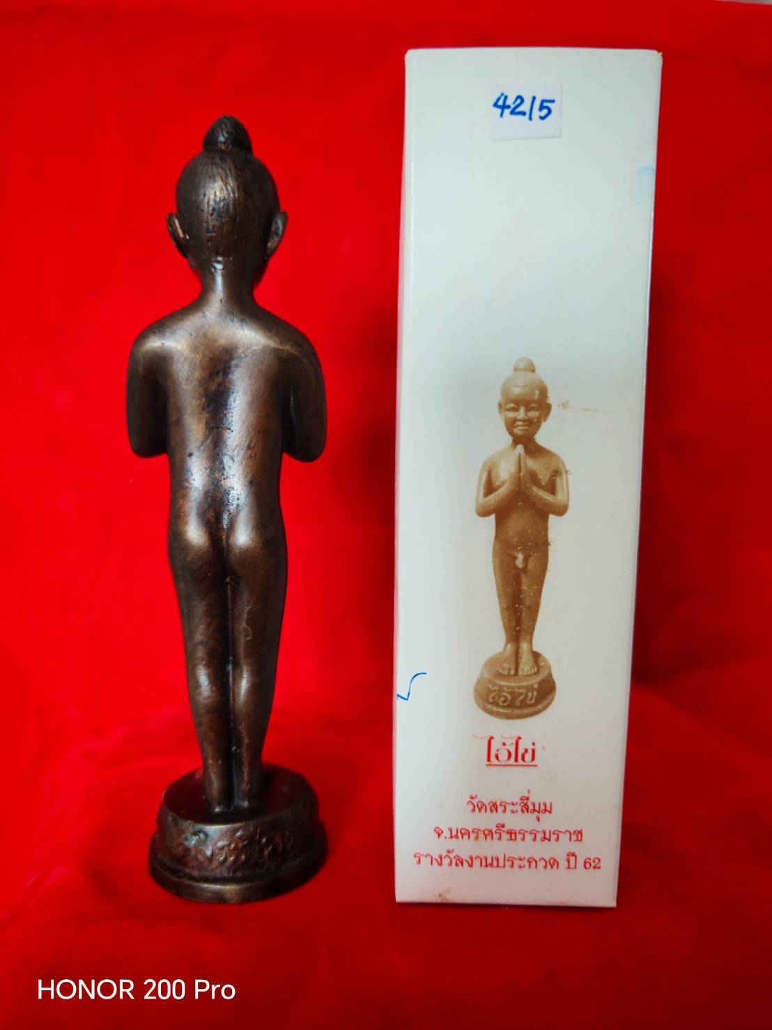 ตอกหมายเลข 4215 เนื้อทองแดง รมดำ พระบูชาไอ้ไข่ ขนาด 6.2 นิ้ว งานประกวดของสมาคมศิษย์เก่าเบญจมราชูทิศ นครศรีธรรมราช ร่วมกับ สมาคมผู้นิยมพระเครื่องพระบูชาไทย สาขานครศรีธรรมราช มาพร้อมกล่องเดิม