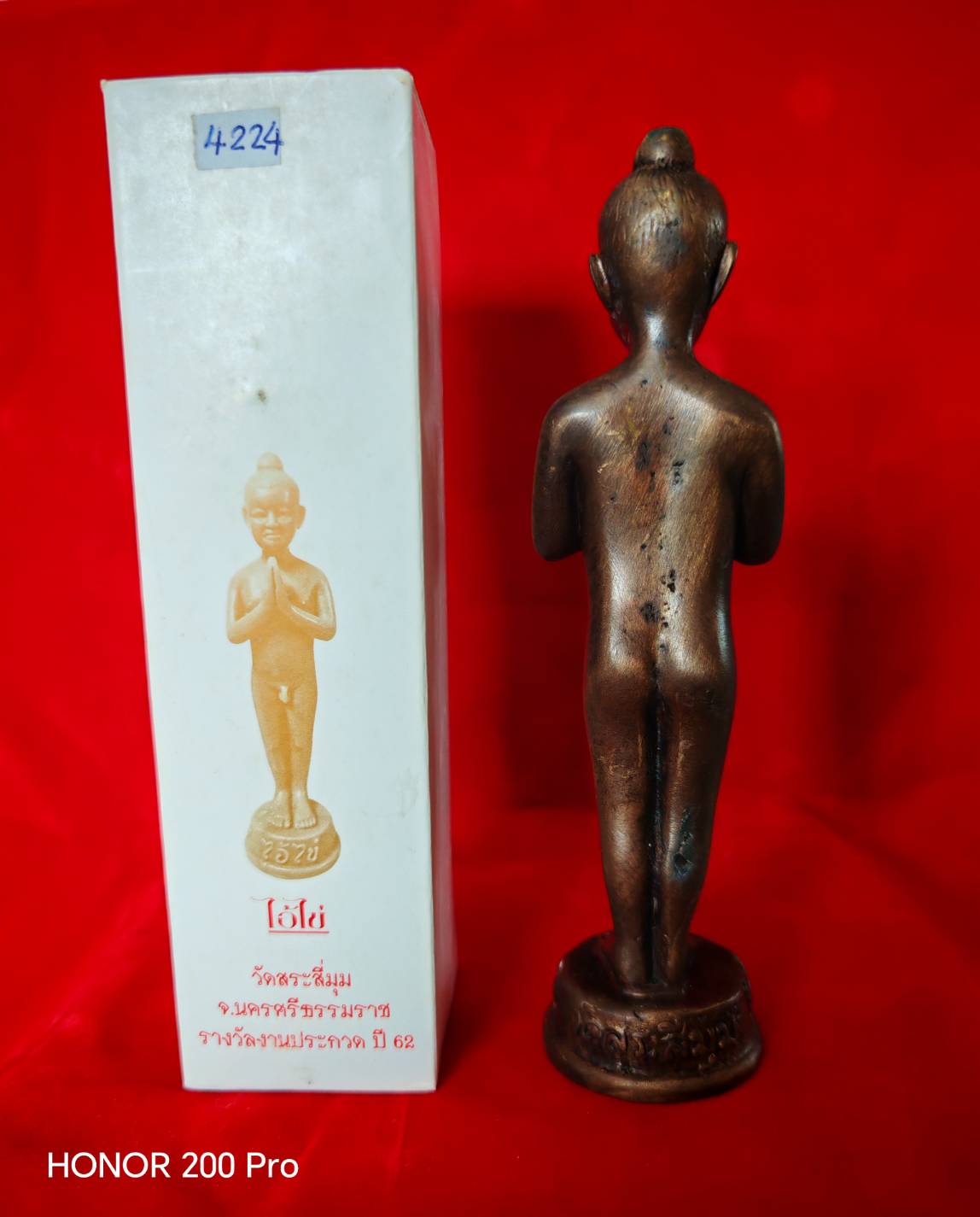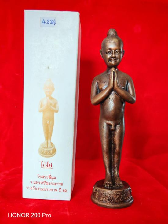 ตอกหมายเลข 4224 เนื้อทองแดง รมดำ พระบูชาไอ้ไข่ ขนาด 6.2 นิ้ว งานประกวดของสมาคมศิษย์เก่าเบญจมราชูทิศ นครศรีธรรมราช ร่วมกับ สมาคมผู้นิยมพระเครื่องพระบูชาไทย สาขานครศรีธรรมราช มาพร้อมกล่องเดิม