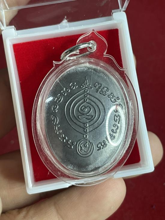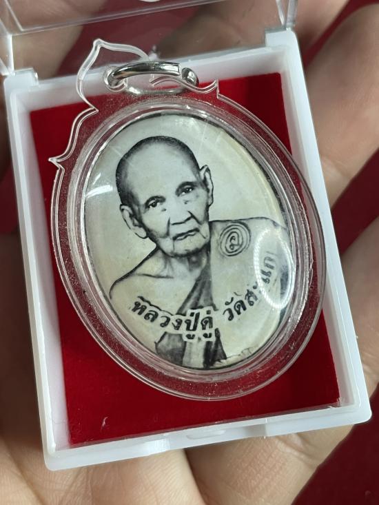 หลวงปู่ดู่ วัดสะแก ฉากขาว ซีเปีย พิมพ์รูปไข่ หลังยันต์ เนื้อตะกั่ว ปี 53 พร้อมเลี่ยม