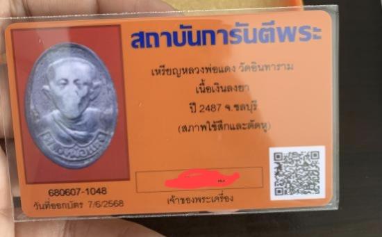 เหรียญหลวงพ่อแดง วัดใหญ่อินทาราม จ.ชลบุรี เนื้อเงินลงยา ปี2487 บัตร g pra
