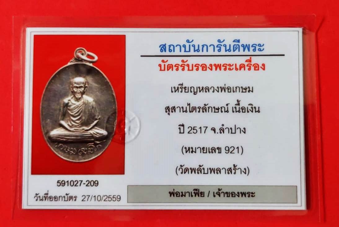 เหรียญหลวงพ่อเกษม เขมโก อนุสรณ์สร้างอุโบสถ วัดพลับพลา จ.นนทบุรี ปี.2517 เนื้อเงิน เลข 921 พร้อมบัตรG-PRA