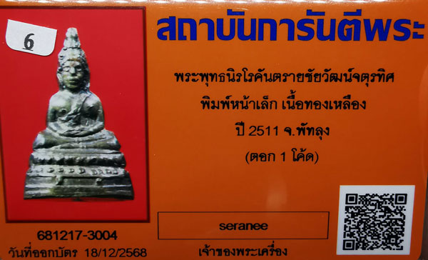 พระพุทธนิรโรคันตรายชัยวัฒน์จตุรทิศ พิมพ์หน้าเล็ก เนื้อทองเหลือง ปี2511 จ.พัทลุง(ตอก1โค้ด) + บัตรG-pra สภาพเดิมค่ะ