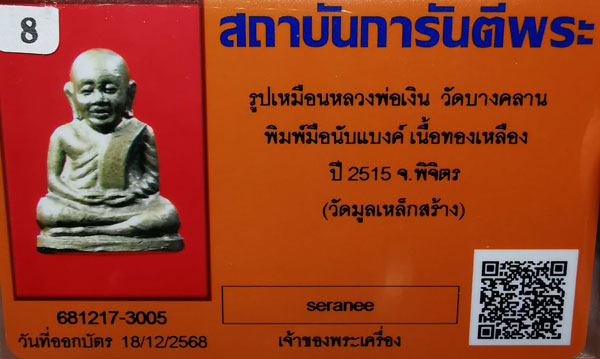 รูปเหมือนหลวงพ่อเงิน วัดบางคลาน พิมพ์มือนับแบงค์ เนื้อทองเหลือง ปี2515 จ.พิจิตร(วัดมูลเหล็กสร้าง ) + บัตร G-pra สภาพสวยเดิมค่ะ