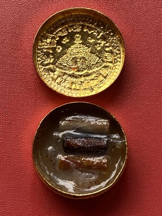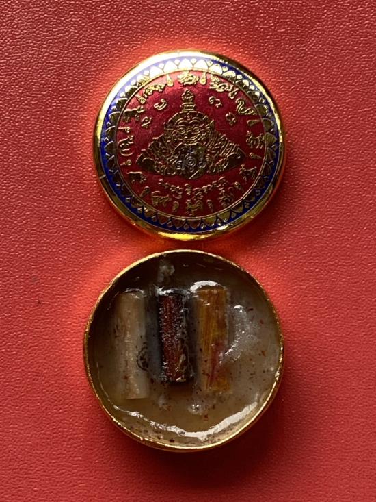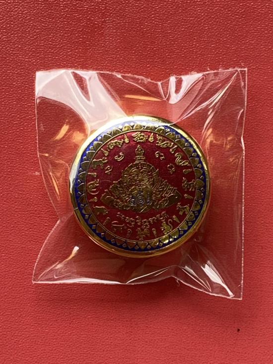 เคาะเดียวแดง สีผึ้งพระราหู รุ่น มงคลจักรวาล เนื้อ โลหะชุบทองลงยาแดงขอบนำ้เงิน ขนาด3.2ซม |