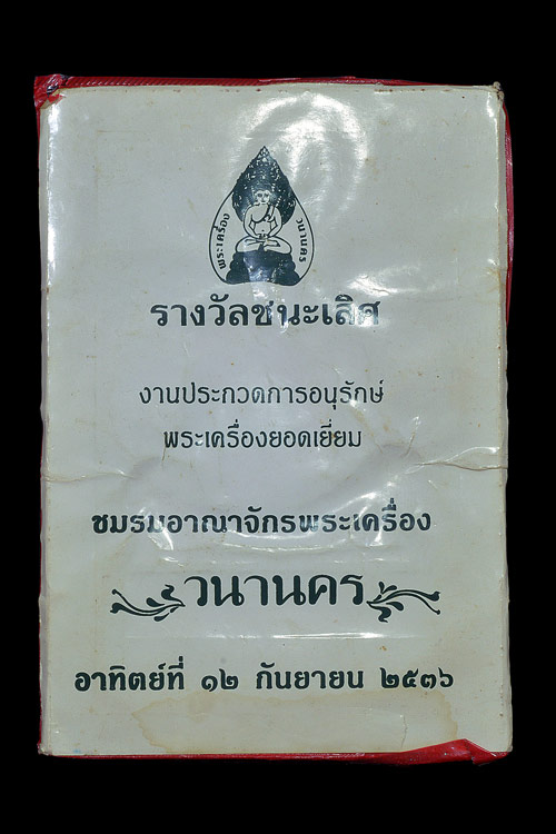 แผ่นปั้มรูปเหมือนนั่งสมาธิ 4 x 6 นิ้ว ( รางวัลชนะเลิศ ) งานประกวดการอนุรักษ์พระเครื่องยอดเยี่ยม ชมรมอาณาจักรพระเครื่อง วนานคร เมื่อวันอาทิตย์ที่ 12 กันยายน พ.ศ.2536 ( ซองเดิม , เนื้อทองแดง )