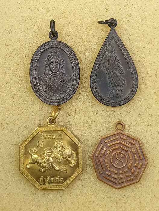 เหรียญเจ้าแม่กวนอิม 2 เหรียญ + พระผงแปดเหลี่ยม เทพเจ้าไท้ส่วยเอี้ย เทพเจ้าคุ้มครองดวงชะตา ว ัดเล่งเน่ยยี่ + เหรียญโชคลาภวัดป่าสัก ชัยนาท + เหรียญยันต์ |