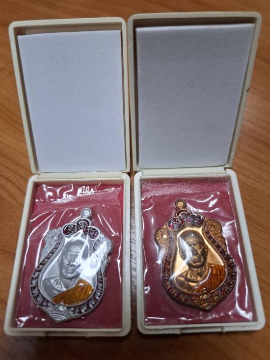 เหรียญเสมาที่ระลึกอายุ 72 ปี ชุด 2 องค์ >เนื้อปีกเครื่องบิน+เนื้อทองแดง พิเศษ ลงยาจีวร+ลงยาขอบแดง หมายเลข 148/153 หลวงพ่อทอง สุทธสีโล วัดบ้านไร่ จ.นครราชสีมา