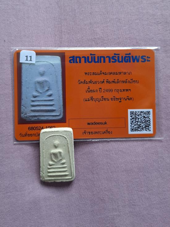 พระสมเด็จมงคลมหาลาภ วัดสัมพันธวงศ์ พิมพ์เล็กหลังเรียบ เนื้อผง ปี 2499 กรุงเทพฯ (แม่ชีบุญเรือน อธิษฐานจิต) |