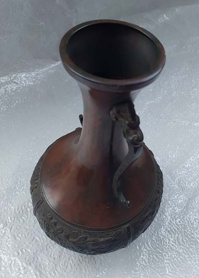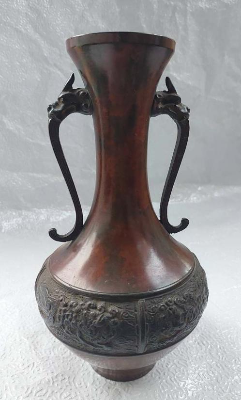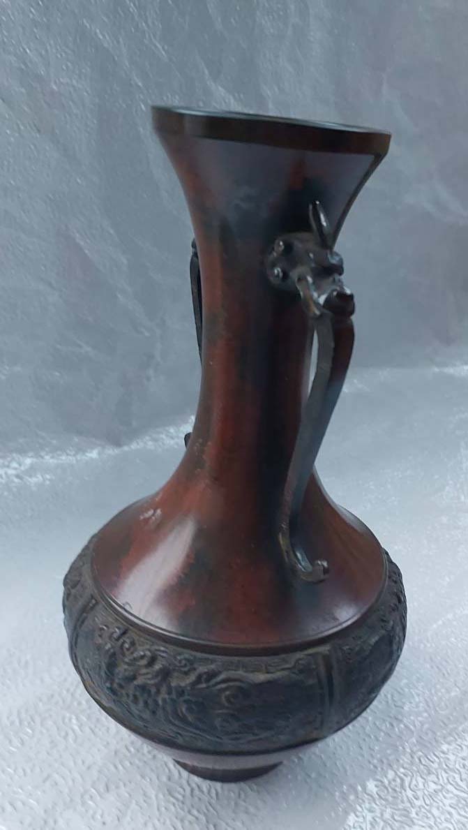 ***วัดใจ***แจกันสำริดเก่าทรงโบราณ หูมังกร สูง 10 นิ้ว กว้างสุด 5.5 ปาก 2.5 นิ้ว ใบนี้หนัก 1 โลกว่า