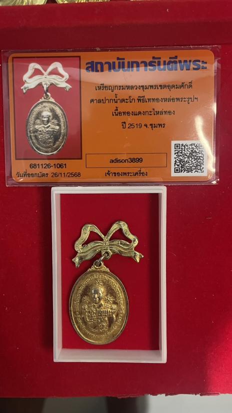 เหรียญกรมหลวงชุมพรเขตอุดมศักดิ์ ศาลปากน้ำตะโก ปี 2519 กะไหล่ทอง พร้อมโบว์กรรมการ รับประกันเท้
