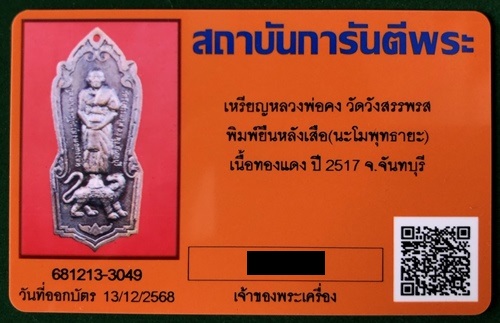 ชื่อพระเครื่อง เหรียญหลวงพ่อคง วัดวังสรรพรส พิมพ์ยืนหลังเสือ ( ตอปิโด ) บล็อคนะโมพุทธายะ ( บล็อควัด นิยม ) จัดสร้างแค่ 200 องค์ เนื้อทองแดง ปี 2517 จ.จันทบุรี สภาพสวยเดิม มาพร้อมบัตรรับรองครับ