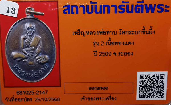 เหรียญพ่อทาบ วัดกระบกขึ้นผึ้ง รุ่น2 เนื้อทองแดง ห่วงเดิม ปี2509 จ.ระยอง + บัตรG-pra สภาพเดิมค่ะ