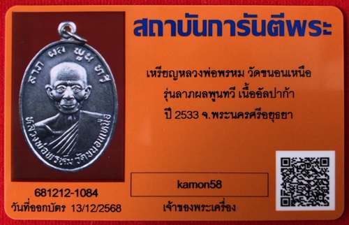 เหรียญหลวงพ่อพรหม วัดขนอนเหนือ รุ่นลาภผลพูนทวี ( เนื้ออัลปาก้า ) หายาก ปี 2533 จ.พระนครศรีอยุธยา สภาพสวย มาพร้อมบัตรรับรองครับ