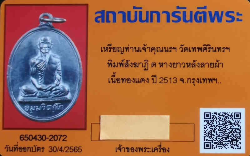 หรียญท่านเจ้าคุณนรฯ วัดเทพศิรินทร์ พิมพ์สังฆาฏิ ต หางยาวหลังลายผ้า เนื้อทองแดง ปี2513 พร้อมบัตรรับรองการันตรีพระ