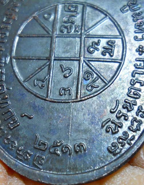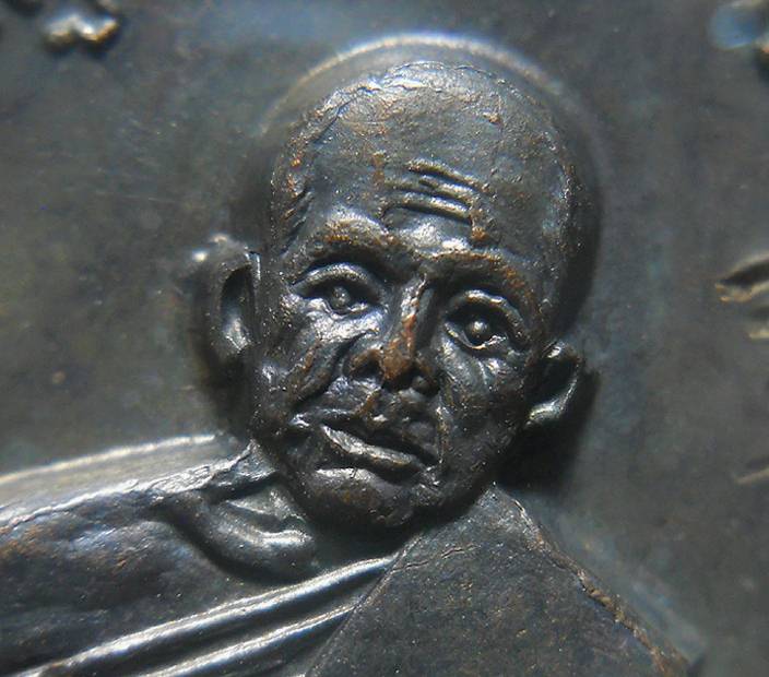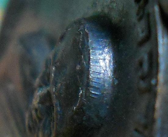 ที่ยอดศีรษะหลวงพ่อ จะเห็นเส้นแพขนานเล็กๆ เกิดจากการแรงกระแทกปั๊ม เหรียญเก๊จากกระบวนการฉีดไม่มีเส้นแพแบบนี้