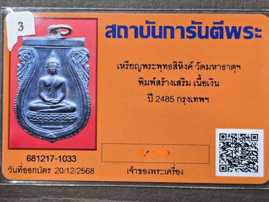 เหรียญพระพุทธสิหิงค์ วัดมหาธาตุ เนื้อเงิน ปี2485 พร้อมบัตรรับรอง