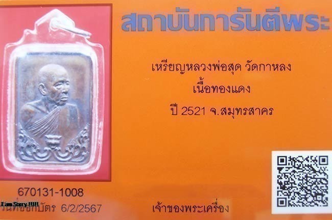 เหรียญแสตมป์ หลวงพ่อสุด วัดกาหลง เนื้อทองแดง ปี 2521 เลี่ยมพลาสติก พร้อมบัตรรับรอง