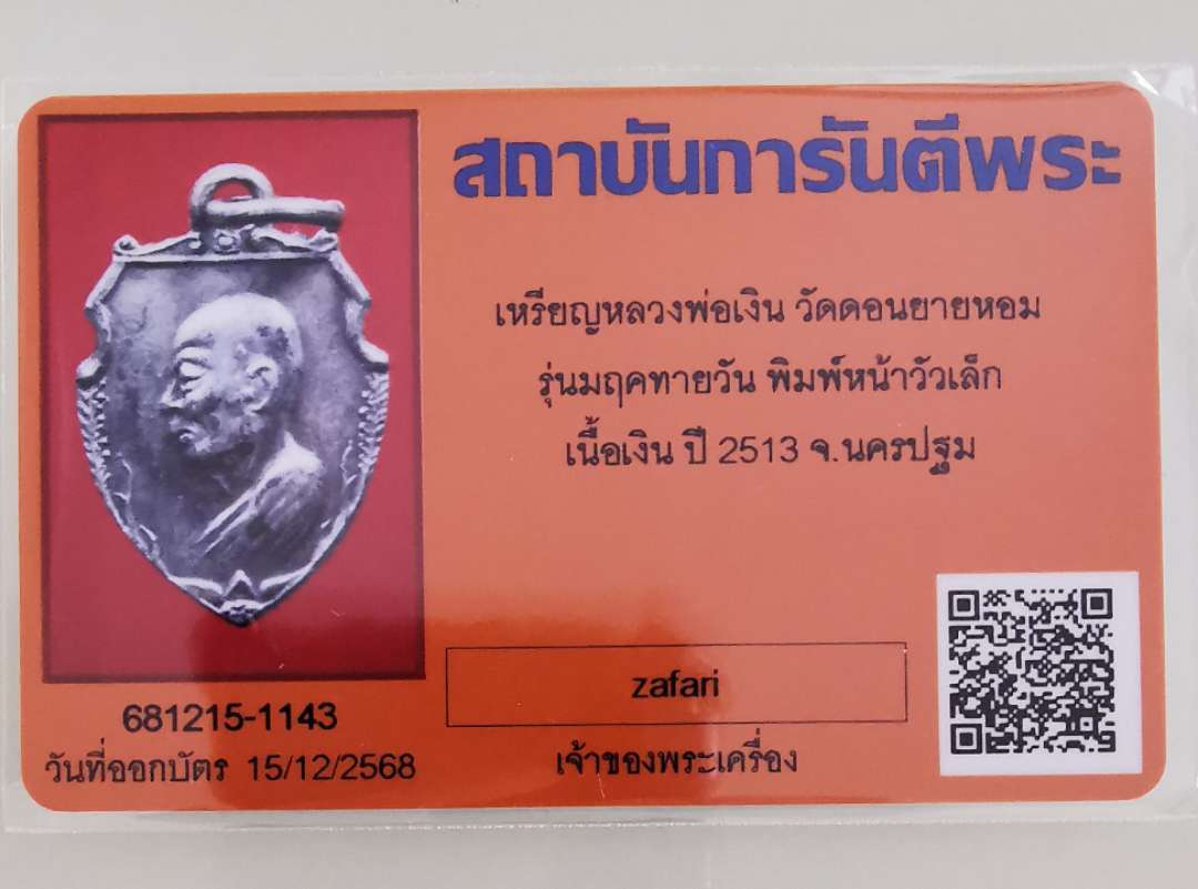 เหรียญหน้าวัวเล็ก มฤคทายวันฯ หลวงพ่อเงิน วัดดอนยายหอม เนื้อเงิน ปี ๒๕๑๓ นครปฐม สวยๆ พร้อมบัตรรับรอง