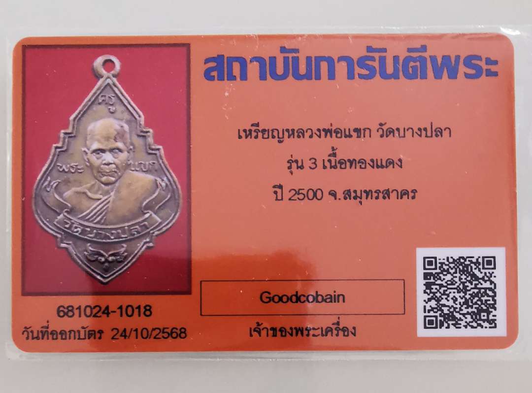 เหรียญหลวงพ่อแขก วัดบางปลา รุ่น 3 ปี 2500 นิยม สวยๆเดิมๆครับ พร้อมบัตรรับรอง