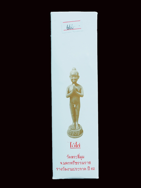 เนื้อกระไหล่ทองชมพู ตอกหมายเลข 666 พระบูชาไอ้ไข่ ขนาด 6.2 นิ้ว งานประกวดของสมาคมศิษย์เก่าเบญจมราชูทิศ นครศรีธรรมราช ร่วมกับ สมาคมผู้นิยมพระเครื่องพระบูชาไทย สาขานครศรีธรรมราช มาพร้อมกล่องเดิม จำนวน ๑