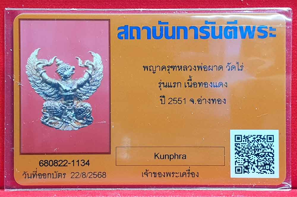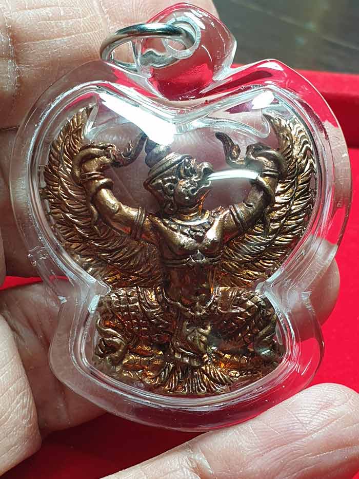 พญาครุฑ รุ่น ๑ หลวงปู่ผาด วัดไร่ จ.อ่างทอง พ.ศ.๒๕๕๑ เหลี่ยมกันน้ำอย่างดีพร้อมห้อยบูชา เคาะเดียวแดง 3,000