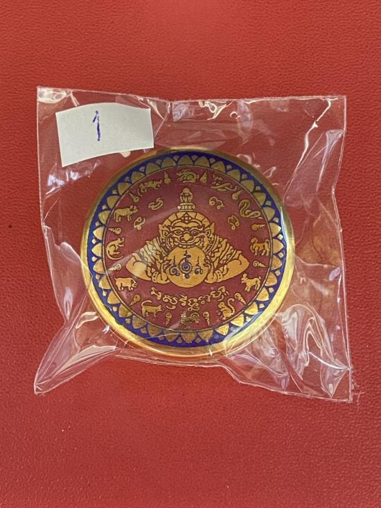 เคาะเดียวแดง สีผึ้งพระราหู รุ่น มงคลจักรวาล เนื้อ โลหะชุบทองลงยาสีแดงขอบสีน้ำเงิน ขนาด3.2ซม |
